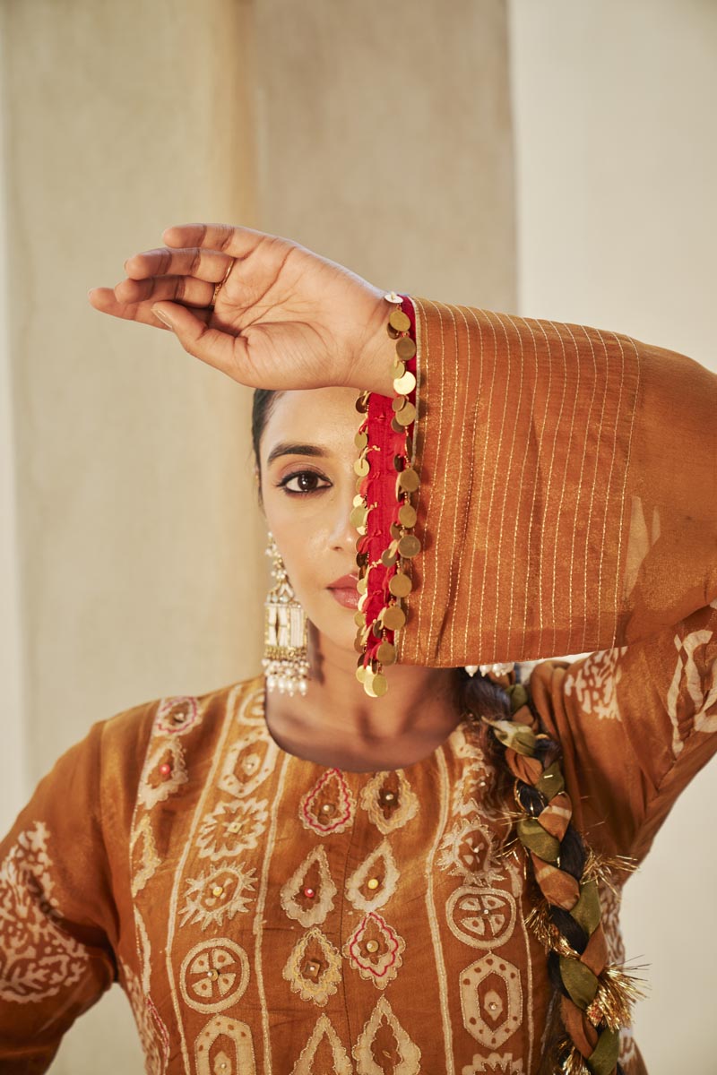 Peach V-neck Short kurta paired with flared pants and dupatta
