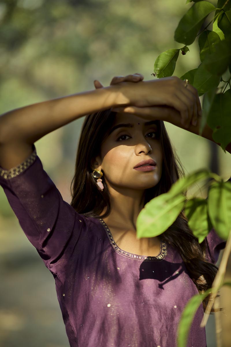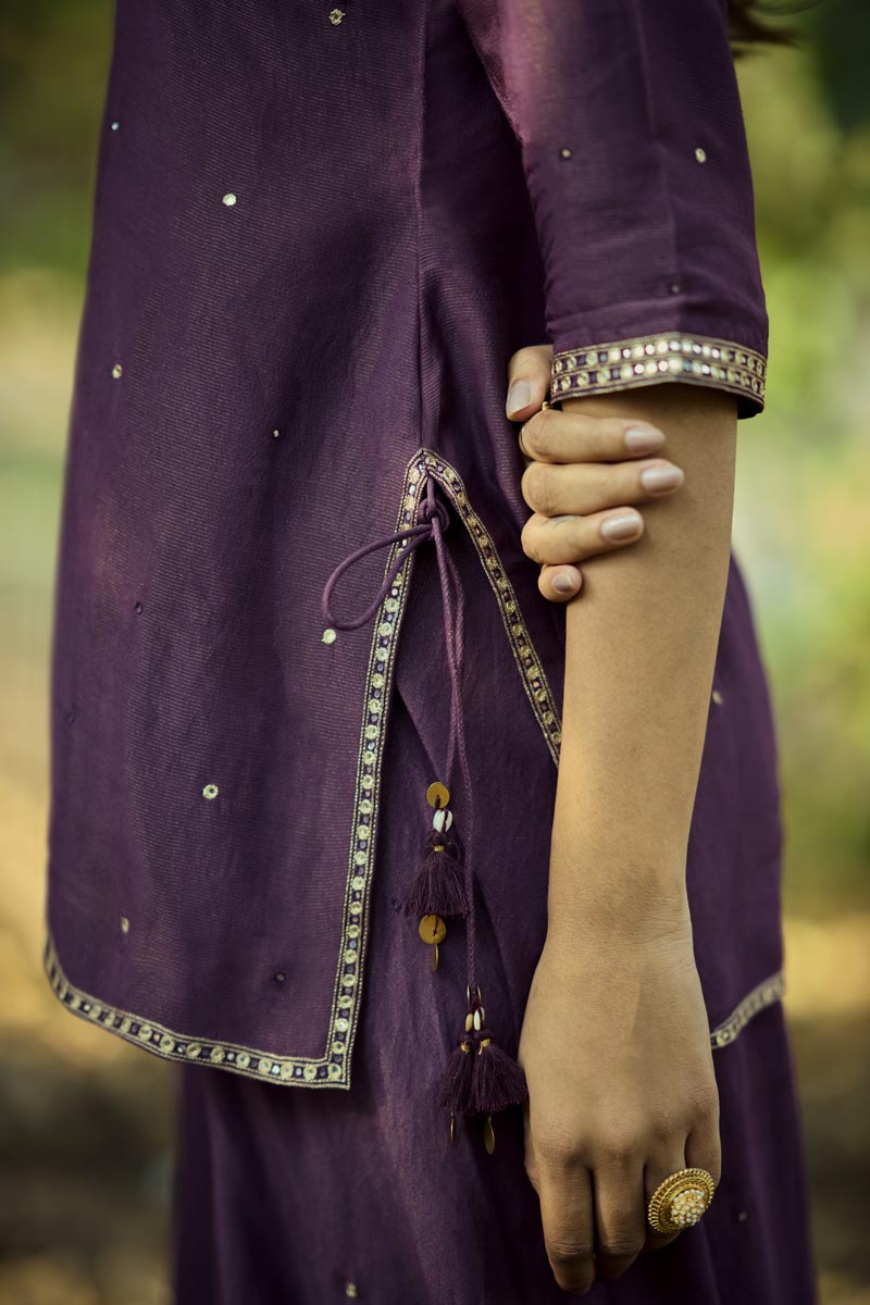 Purple short kurta Paired with Wide Leg Pants and Scallop Edge handwork Dupatta