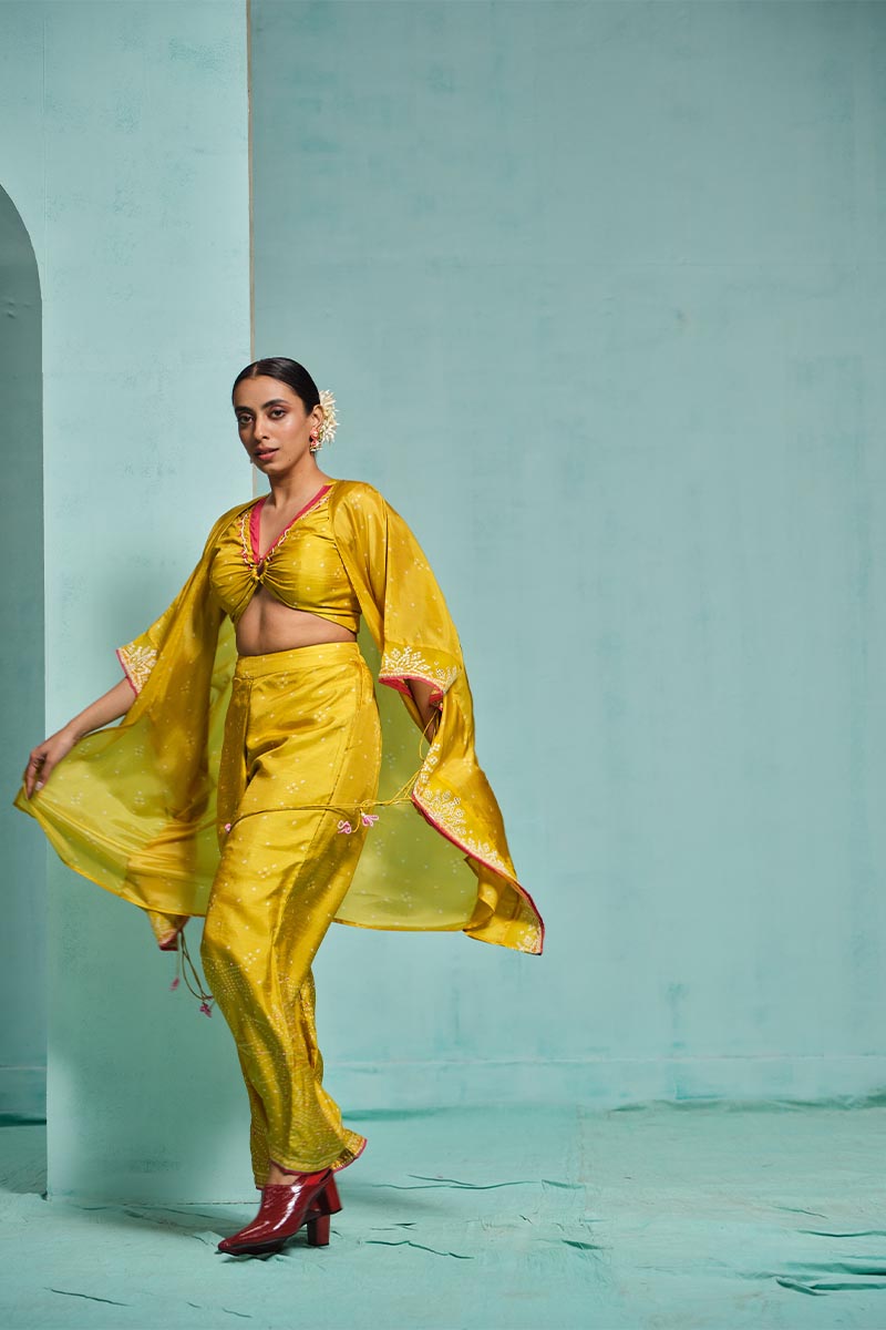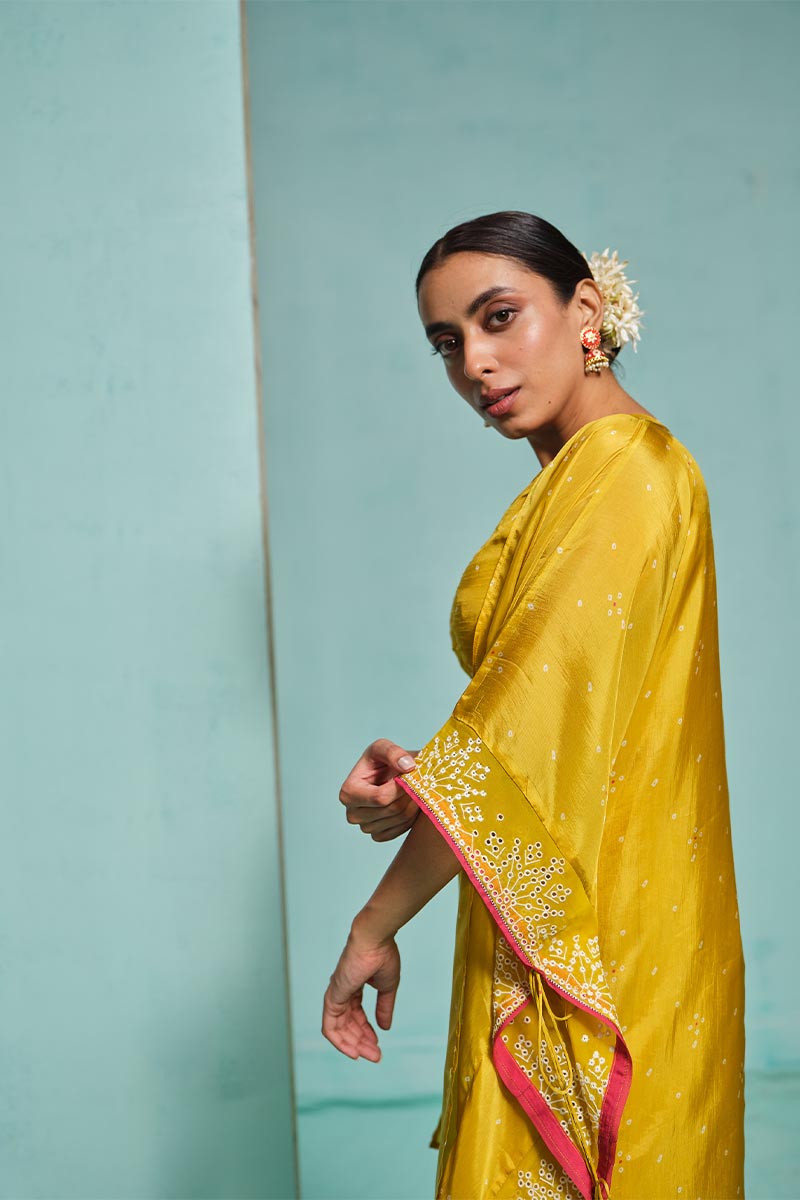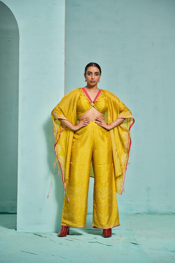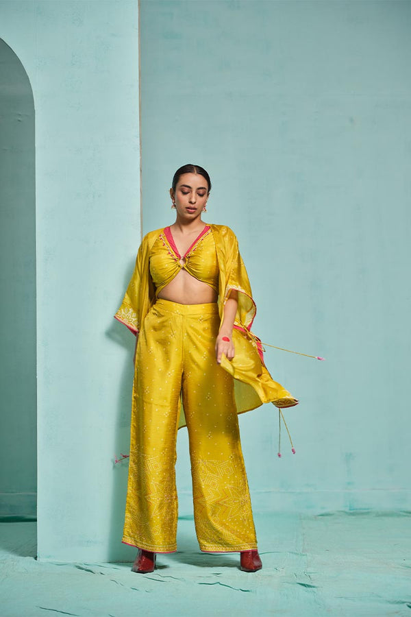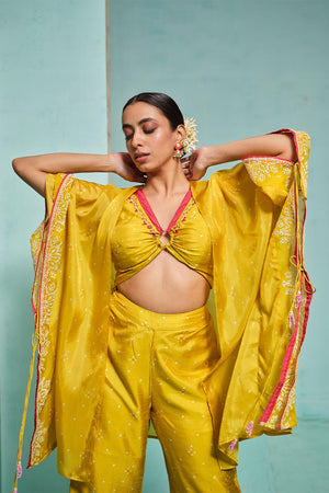 Mustard Yellow Bandhani Print Ring Bustier paired with palazzo and Kimono