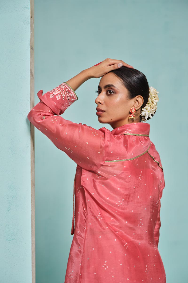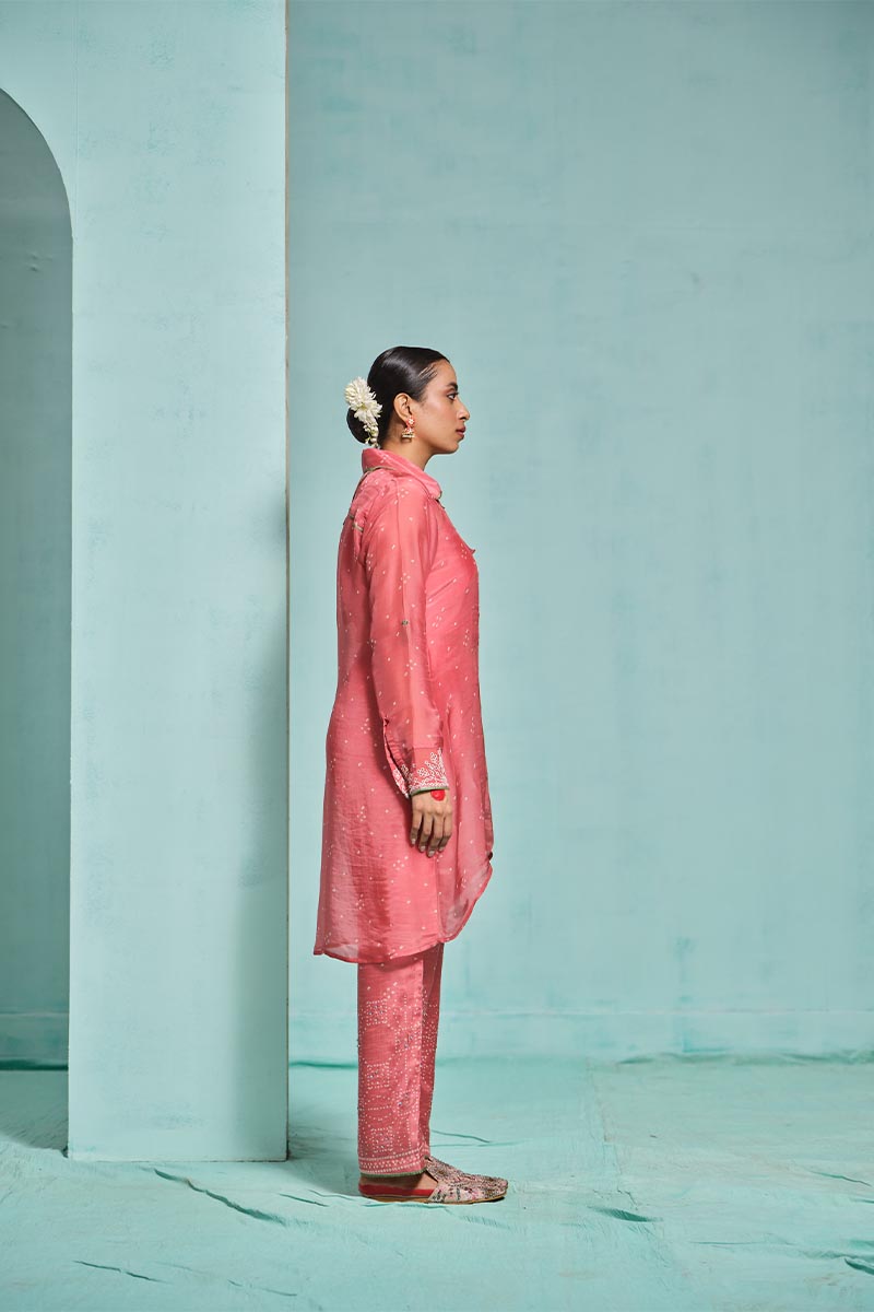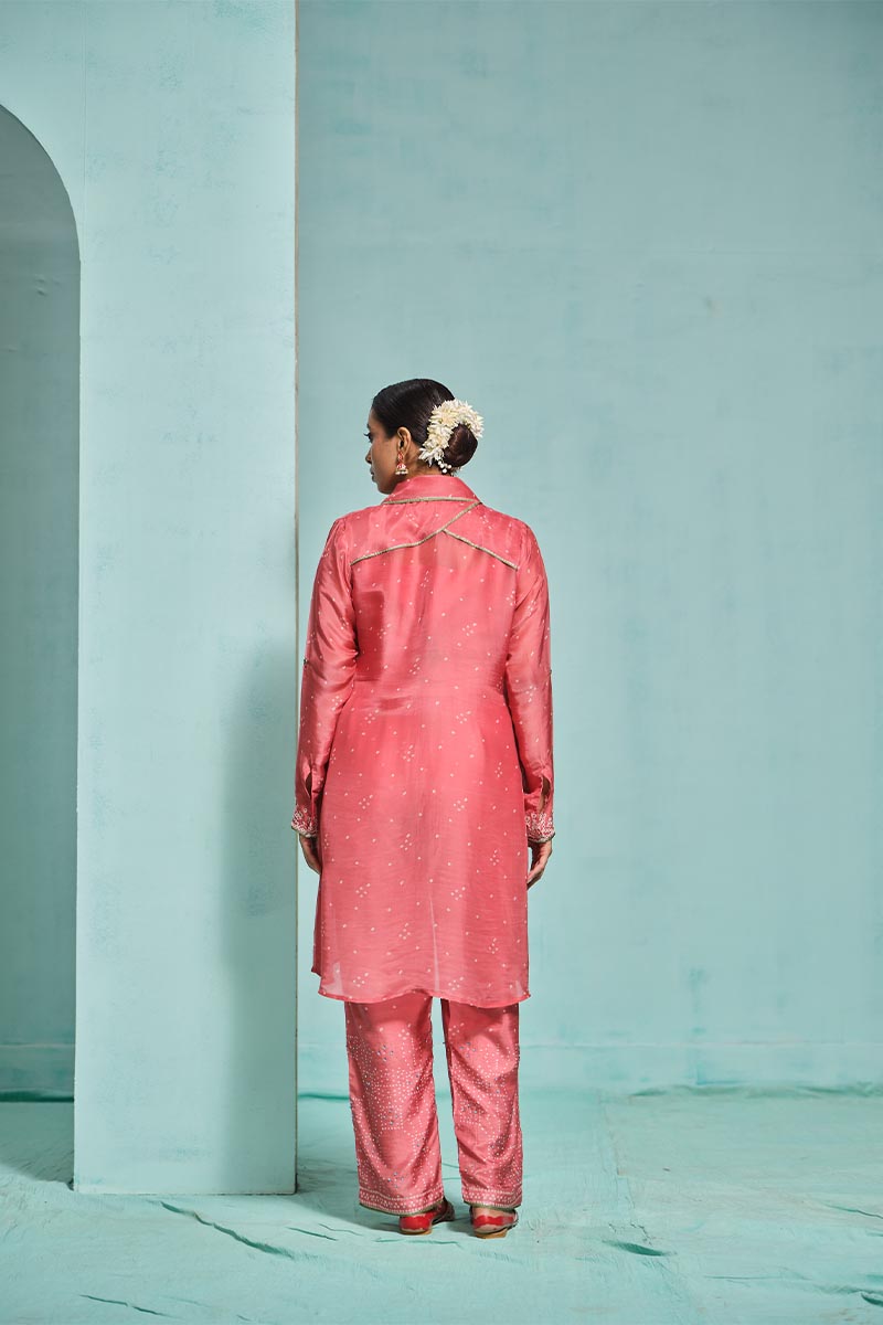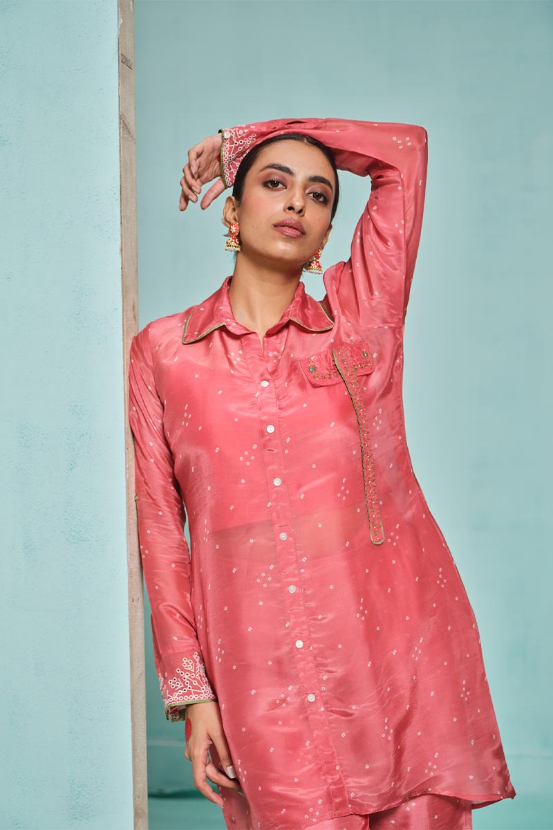Coral Pink Bandhani Print Shirt High Low Co-ord Set