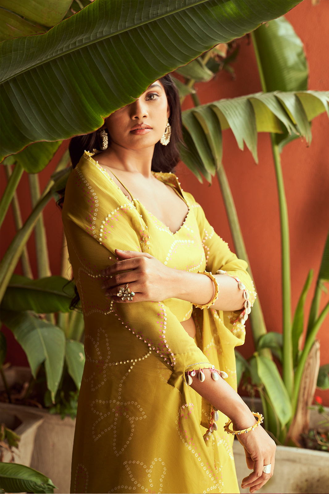 Lime Green Bandhani V-neck Bustier paired with Bandhani Skirt and Organza Kimono Cardigan