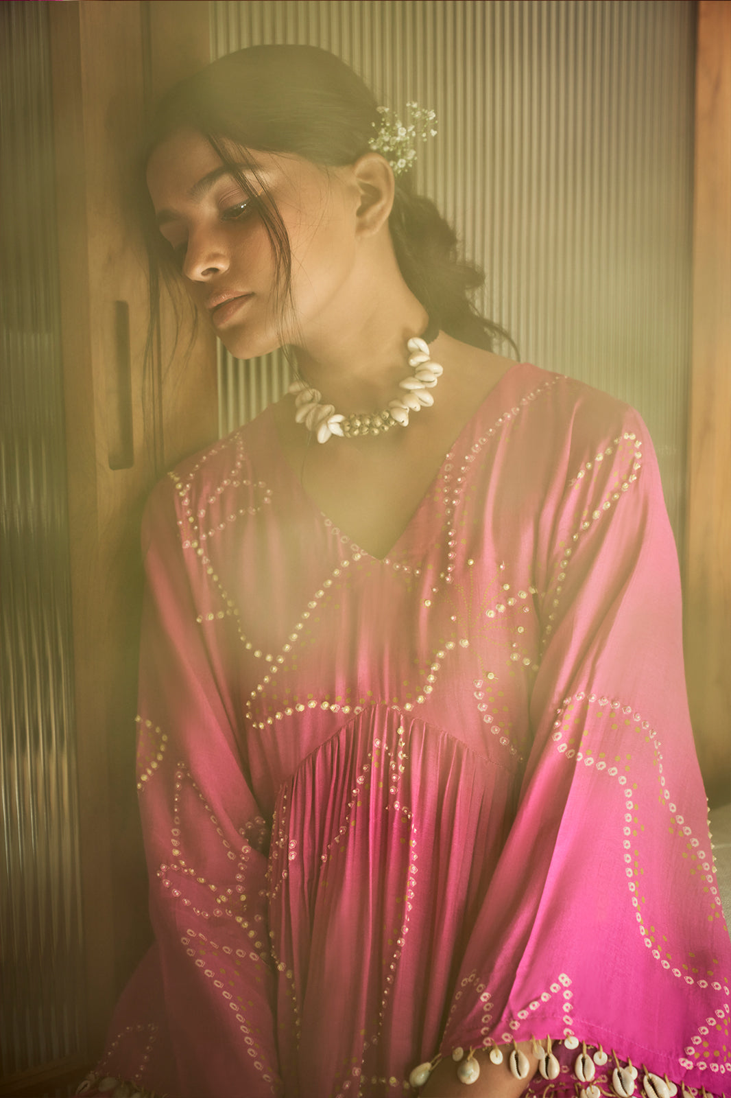 Purple bandhani V-neck Peplum style top paired with Straight Pants