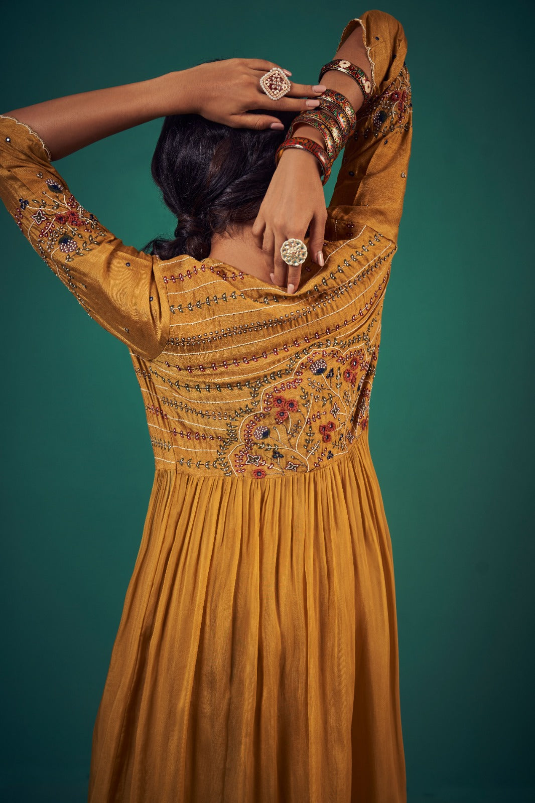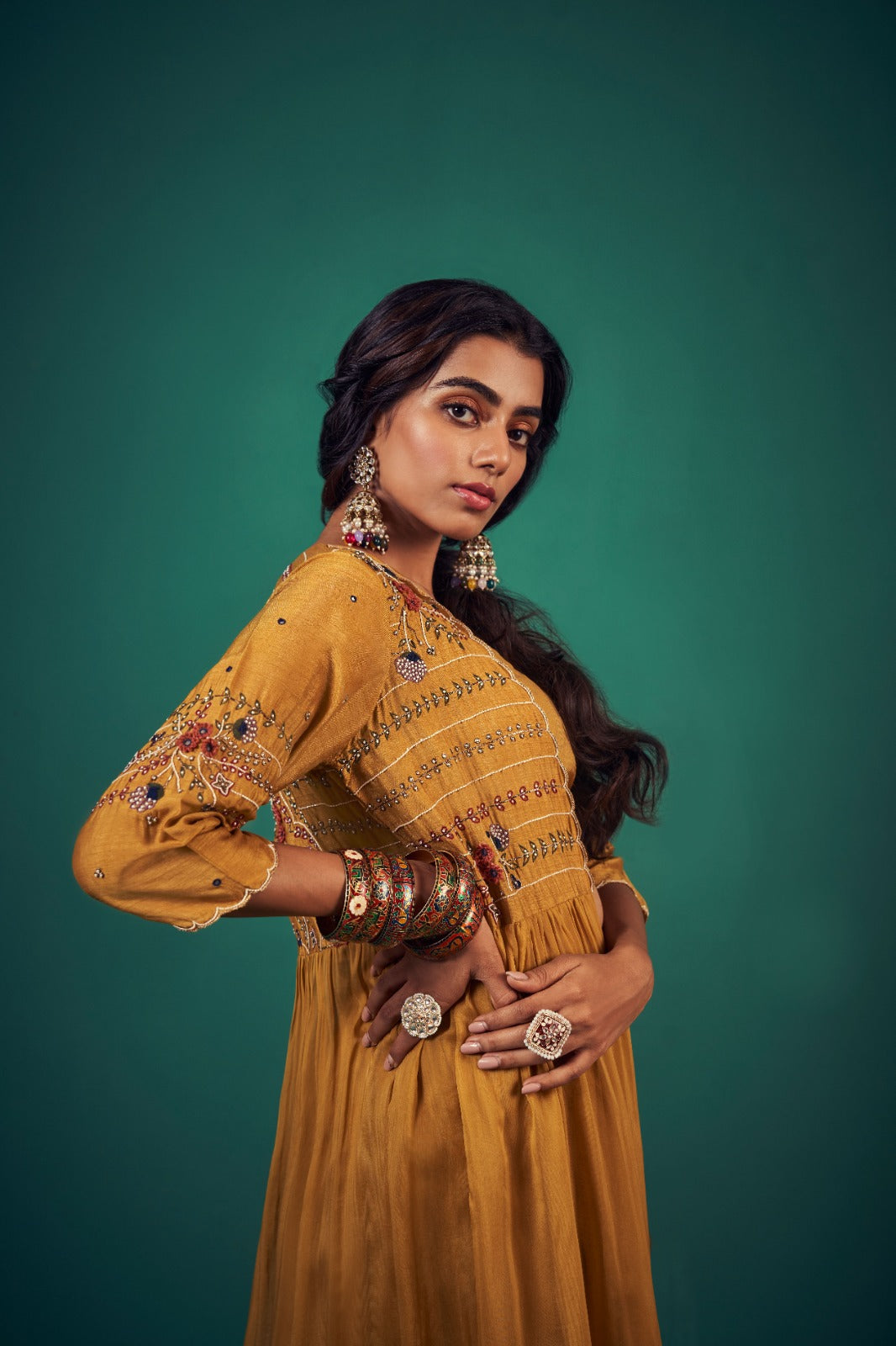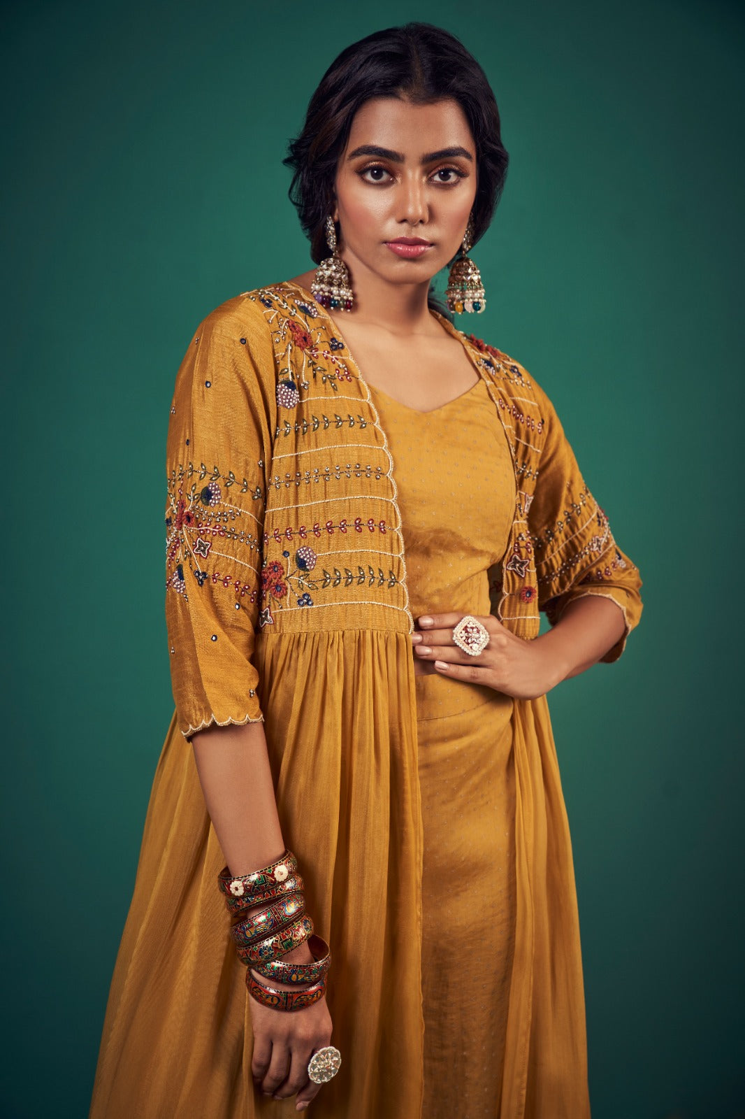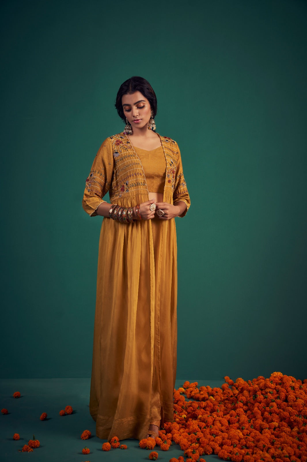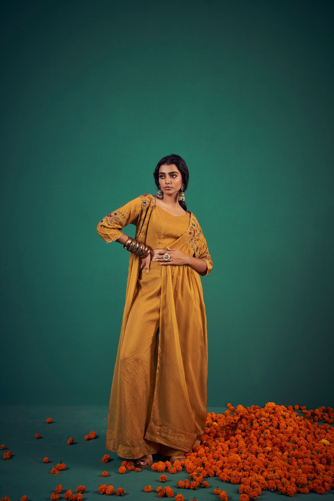 Mustard Yellow Bustier paired with Flared Pants and Jacket