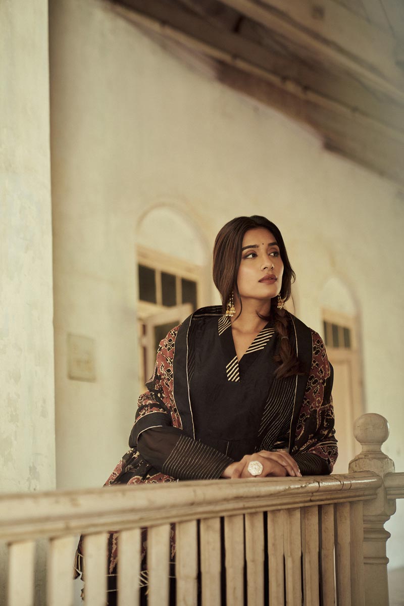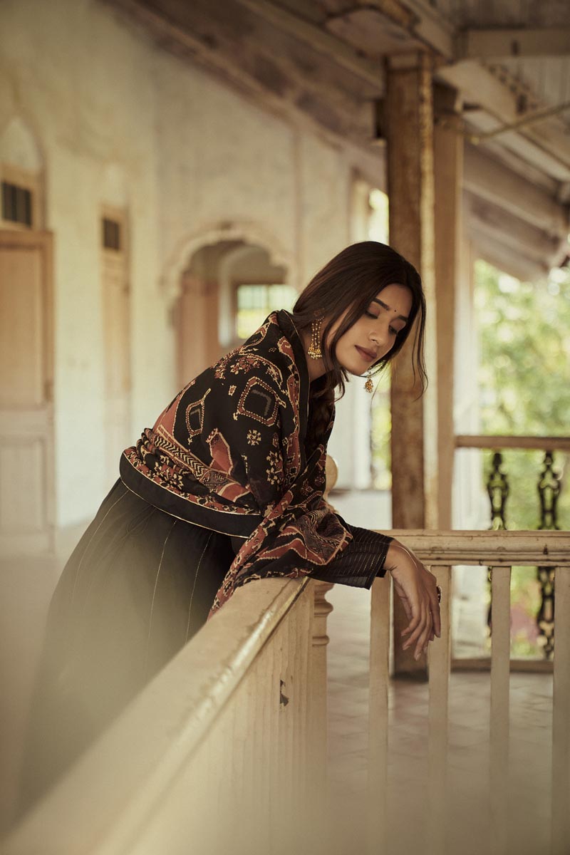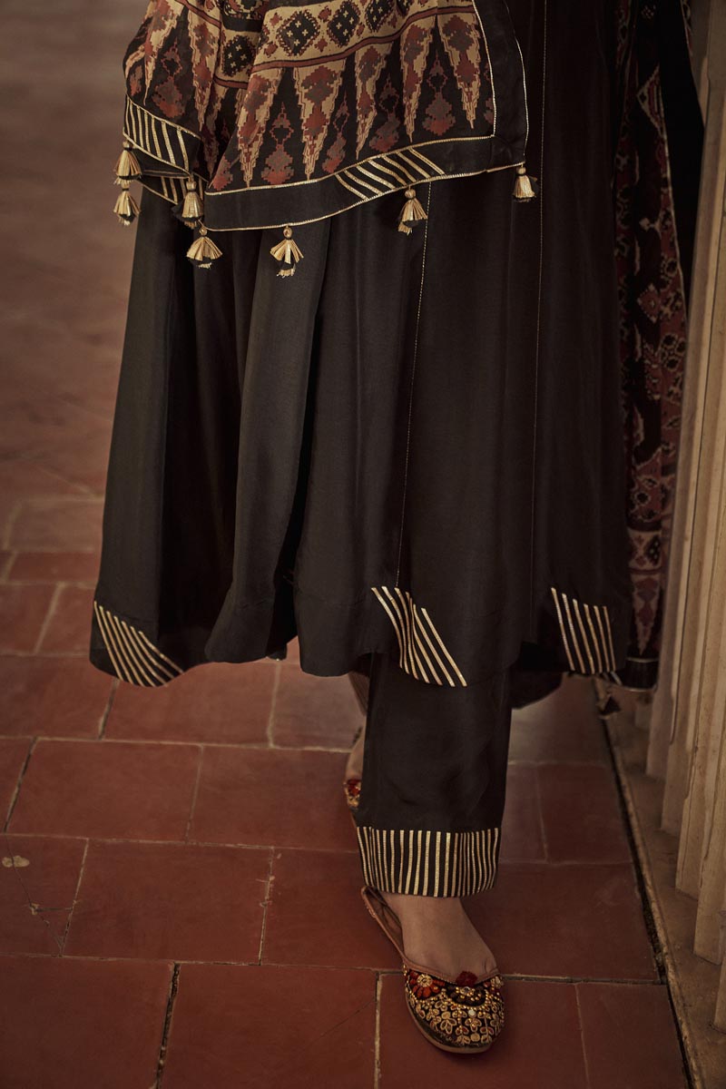 Black V-neck High-Low kurta paired with Straight pants and Ikat Dupatta