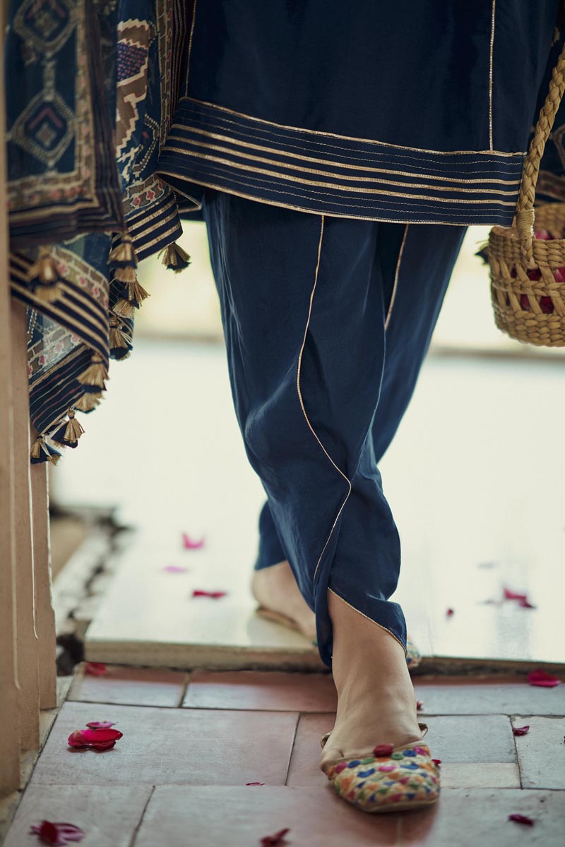 Indigo Blue Mandarin Collar Kurta Paired with Tulip Pants and Ikat Dupatta
