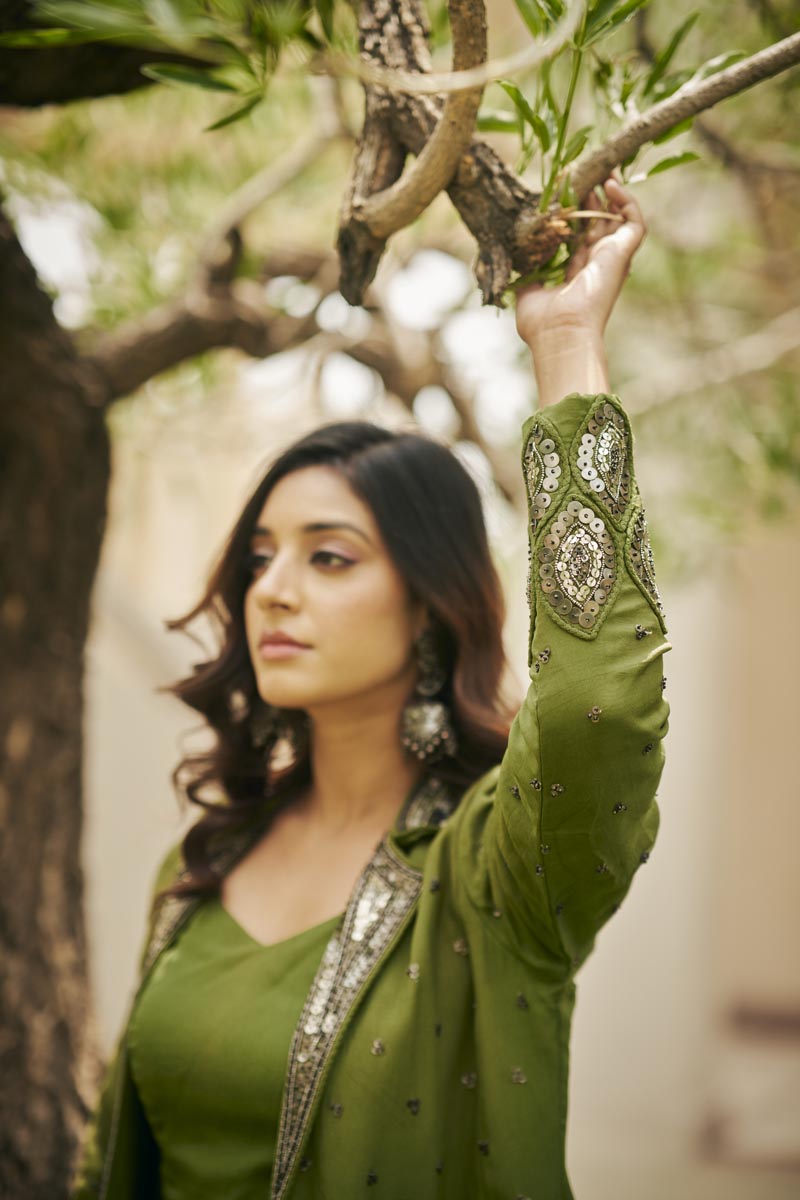 Olive Green V-neck bustier + flared pants + handwork blazer
