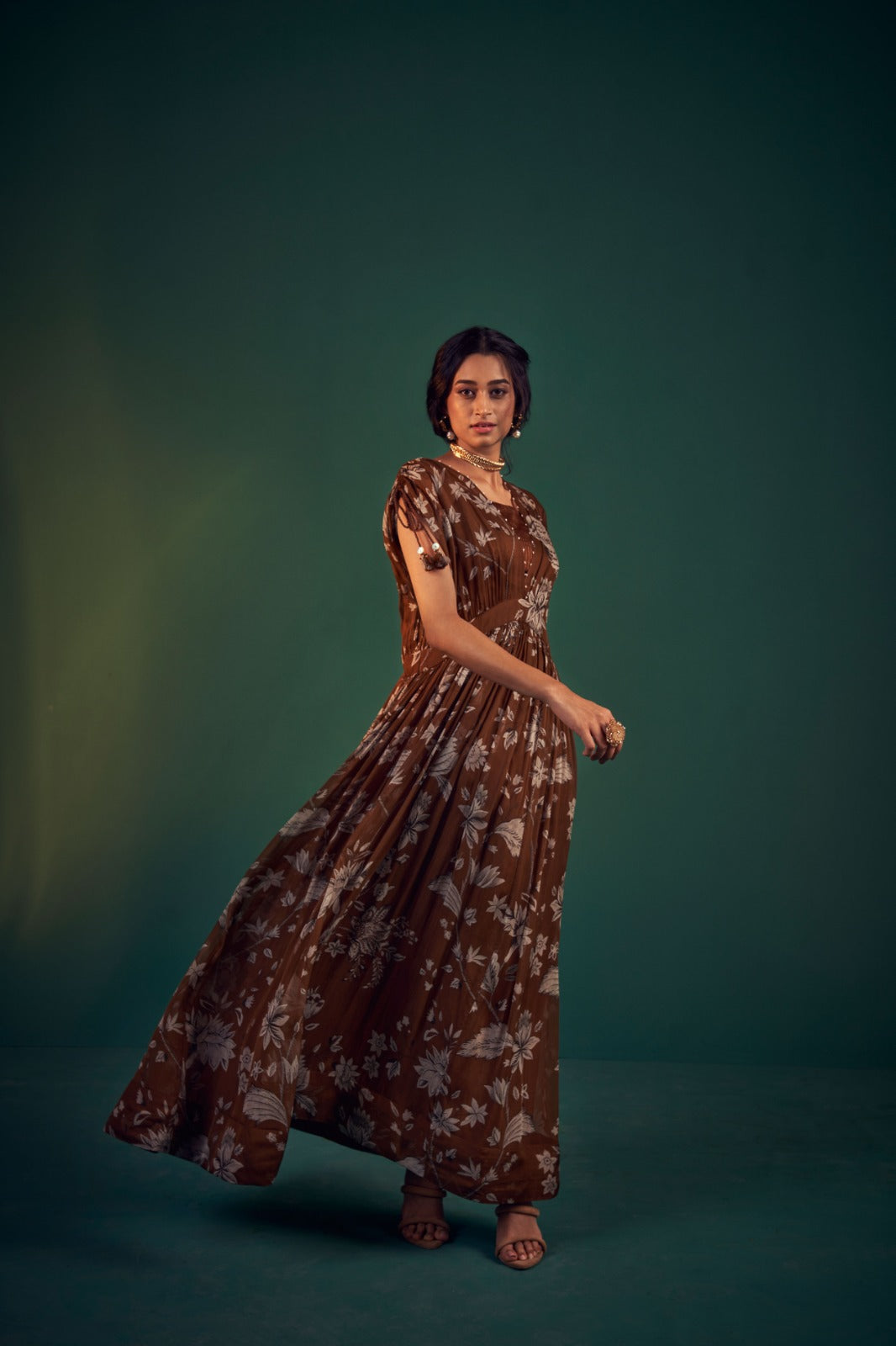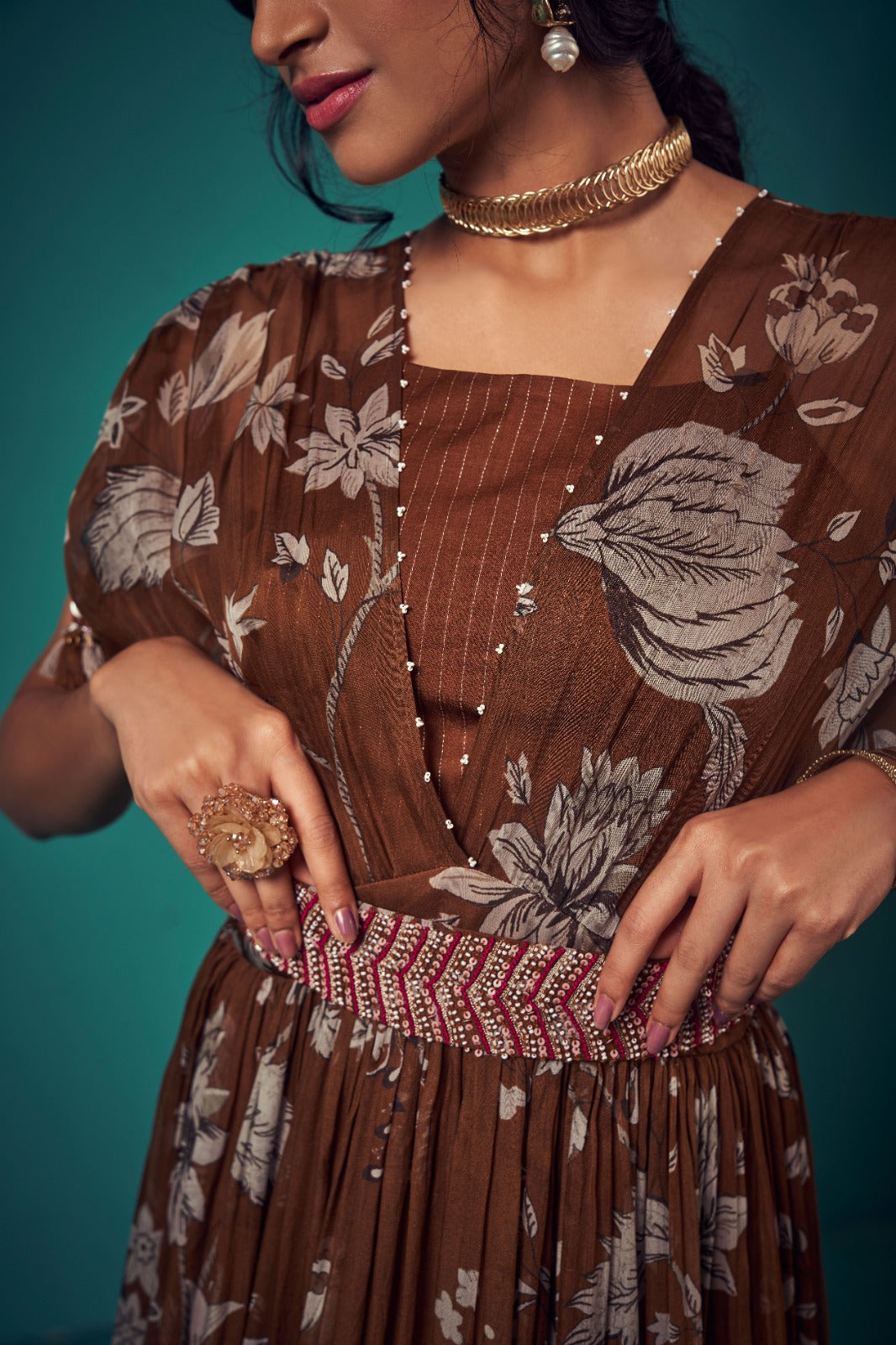Brown Plain Bustier paired with Paisley Print Deep V-Neck Maxi and Belt