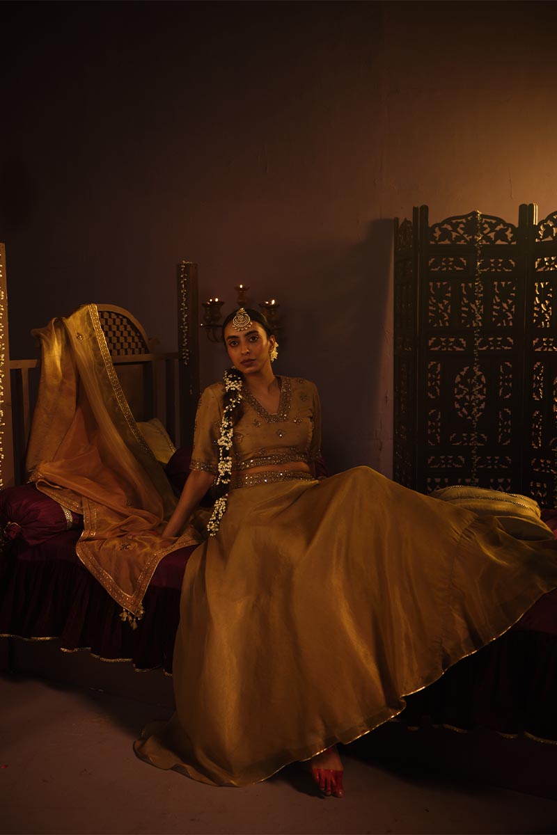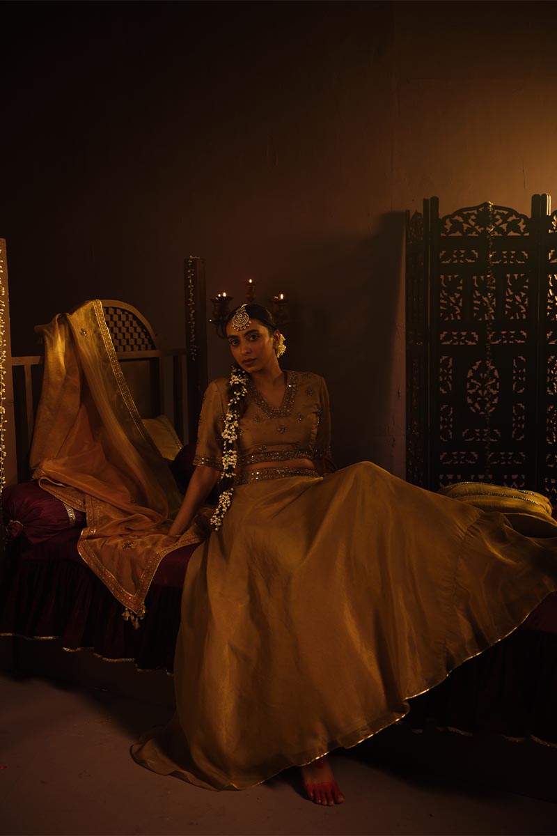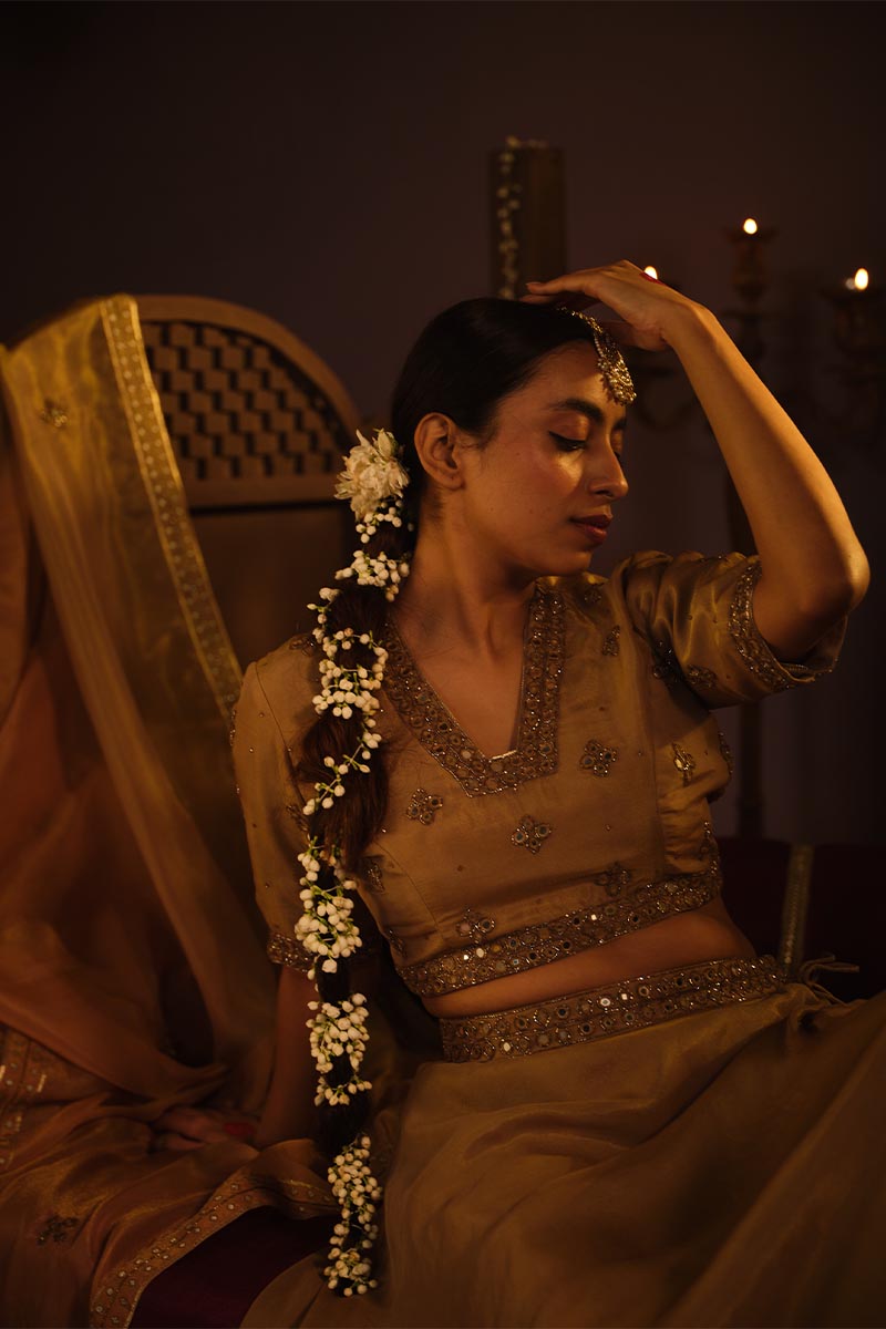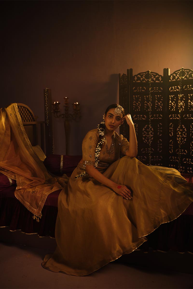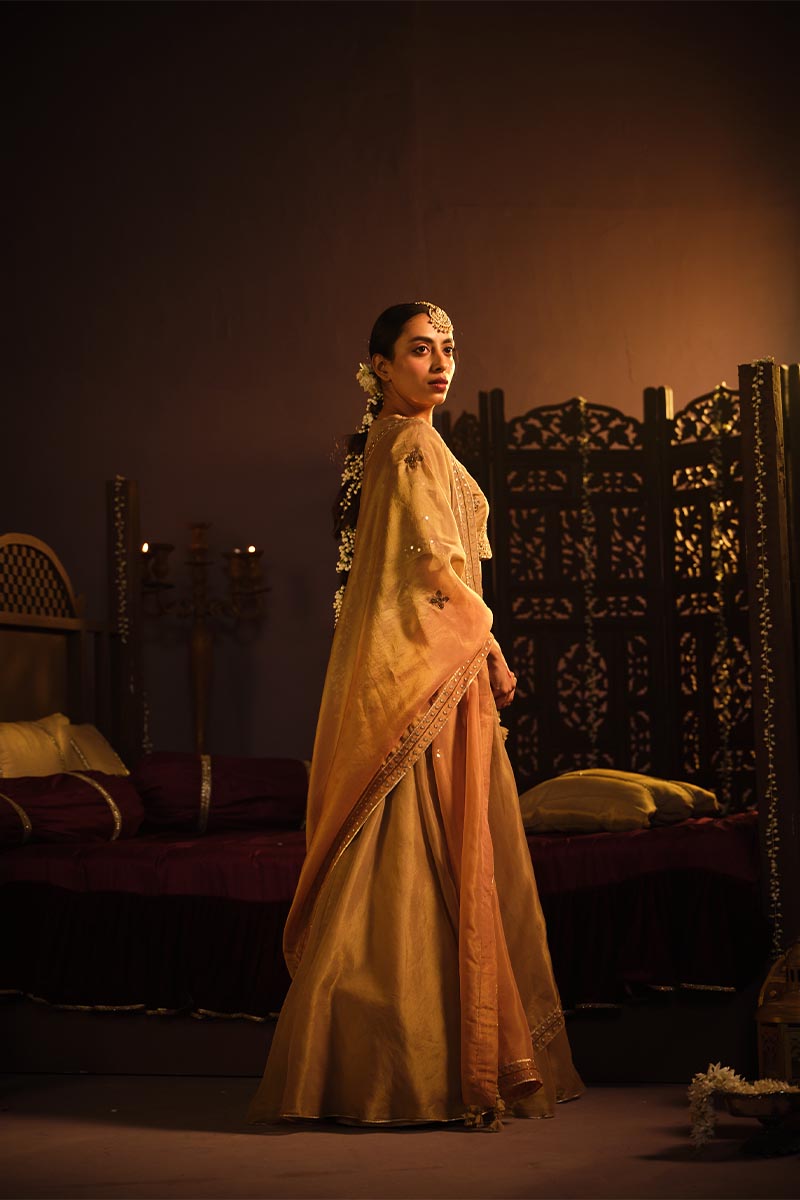 Brown V-Neck Buatier paired with Skirt and Pink-Brown ombre Dupatta