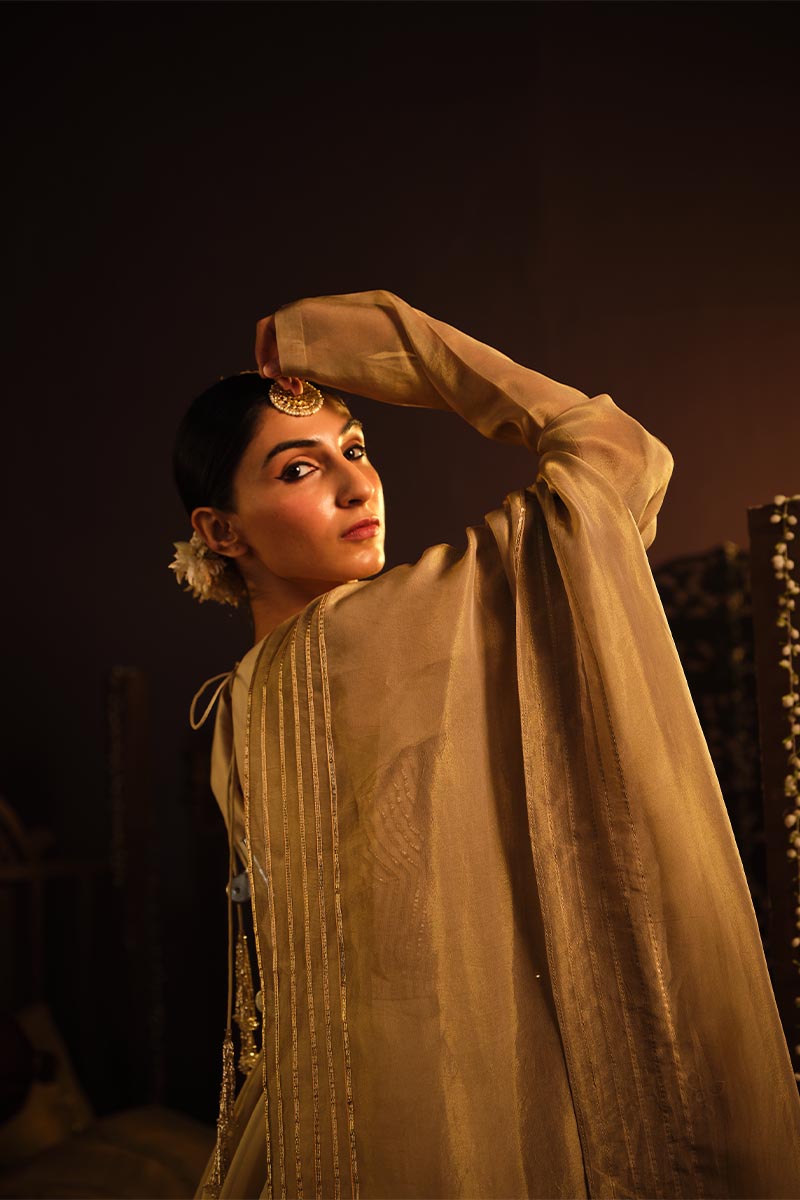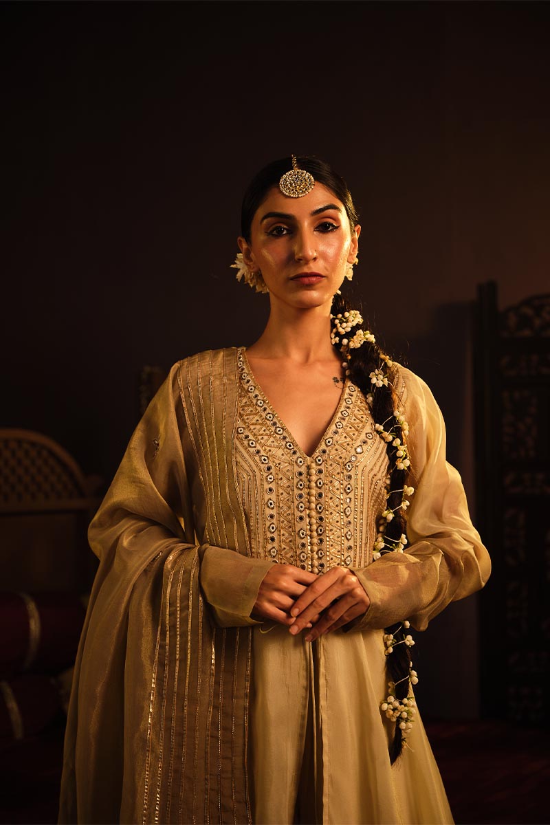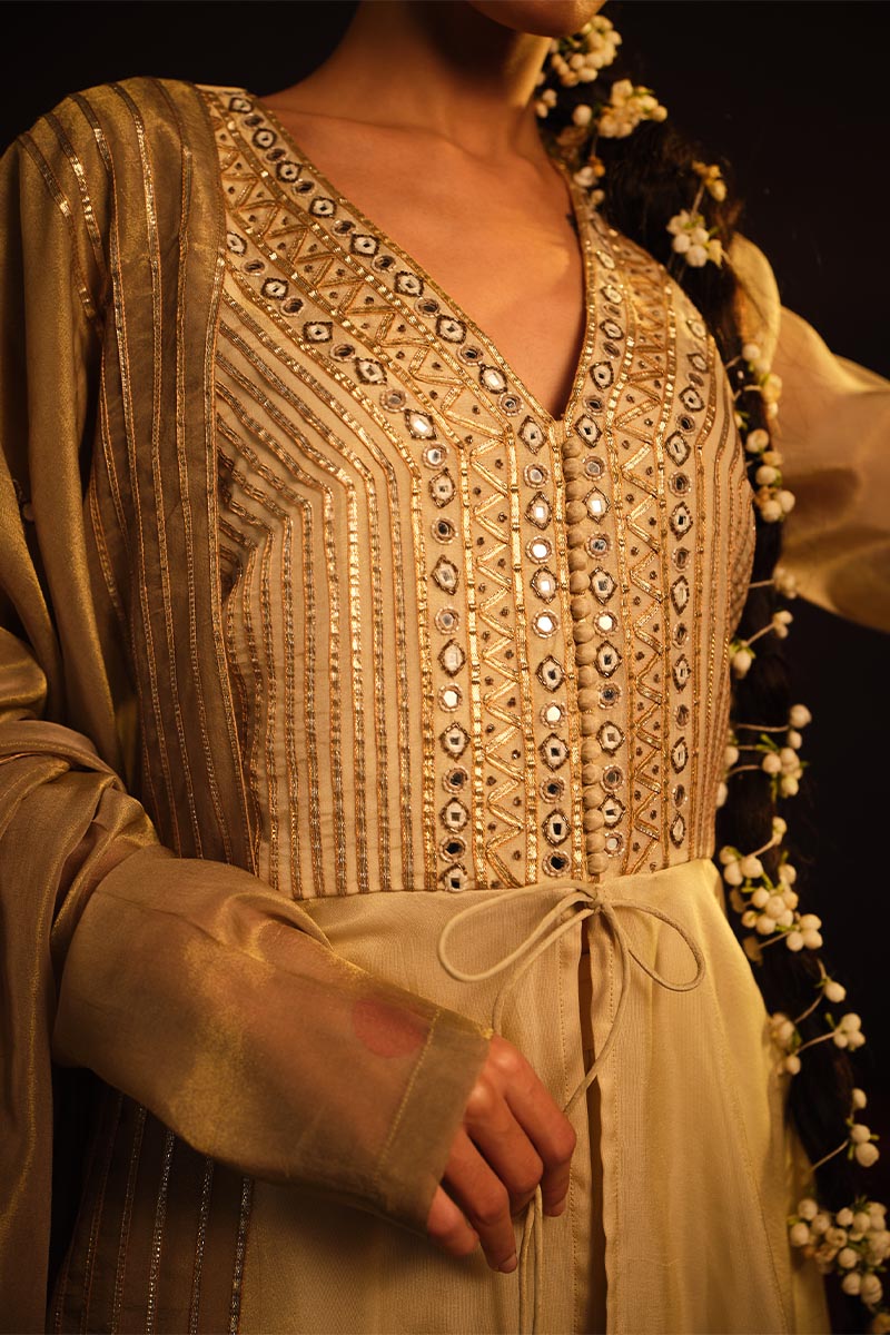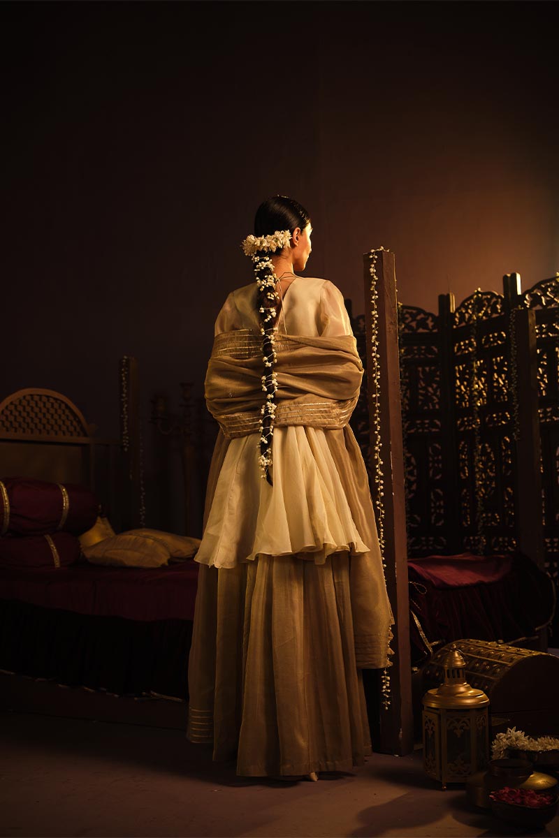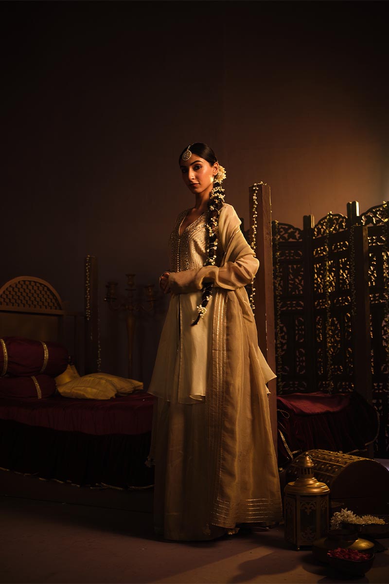 Cream V-Neck Mirror work Peplum Paired with Ombre Flared Pants and Dupatta