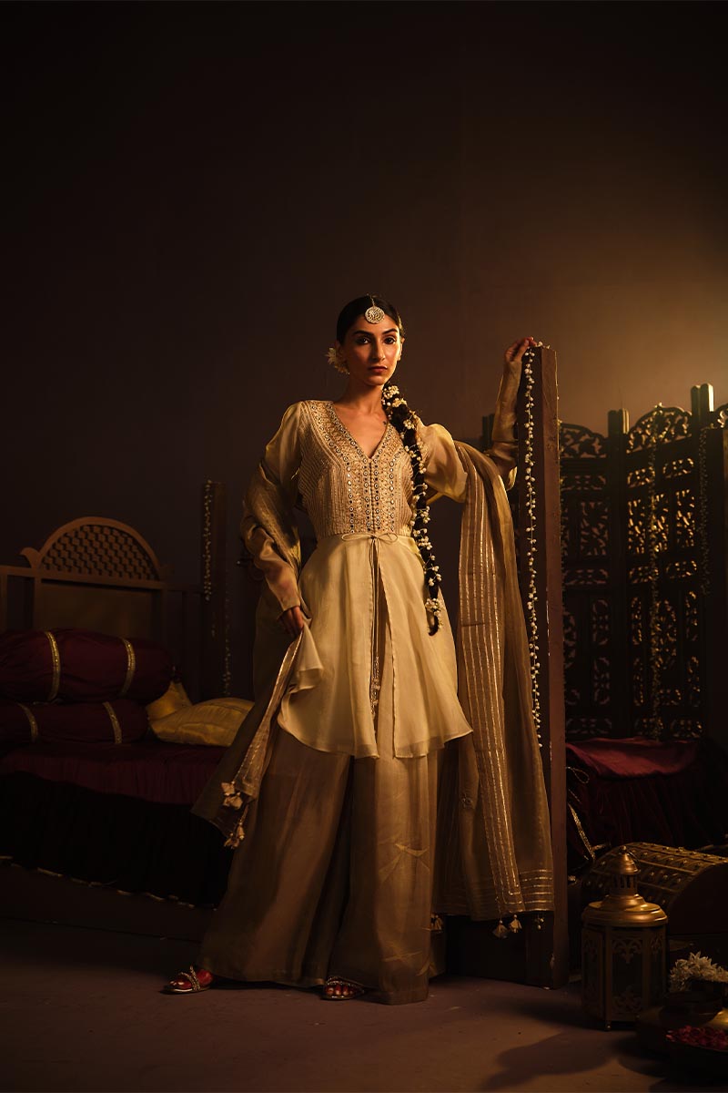 Deep purple noodle strap circular cut kurta paired with a wide leg ants and dupatta