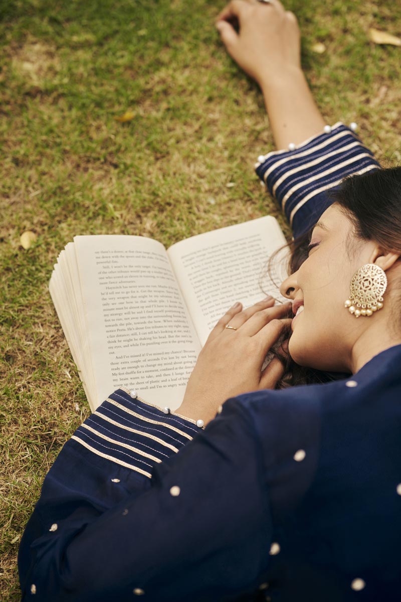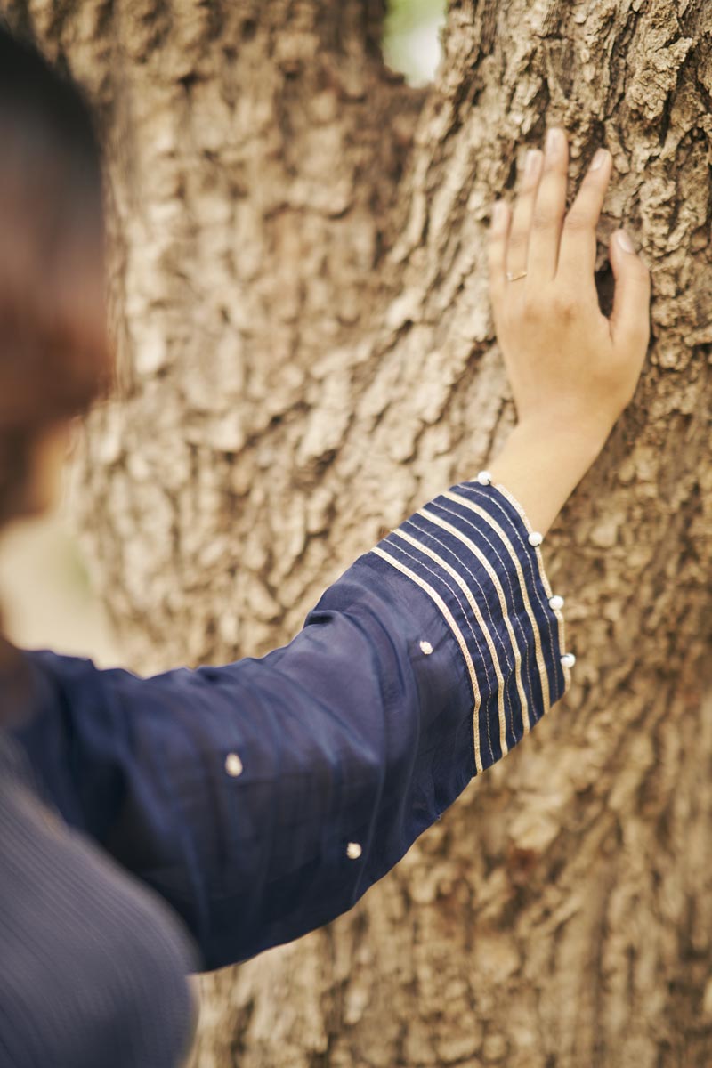 Mid Night Blue In-ut zari bustier paired with palazzo and boox pleats jacket